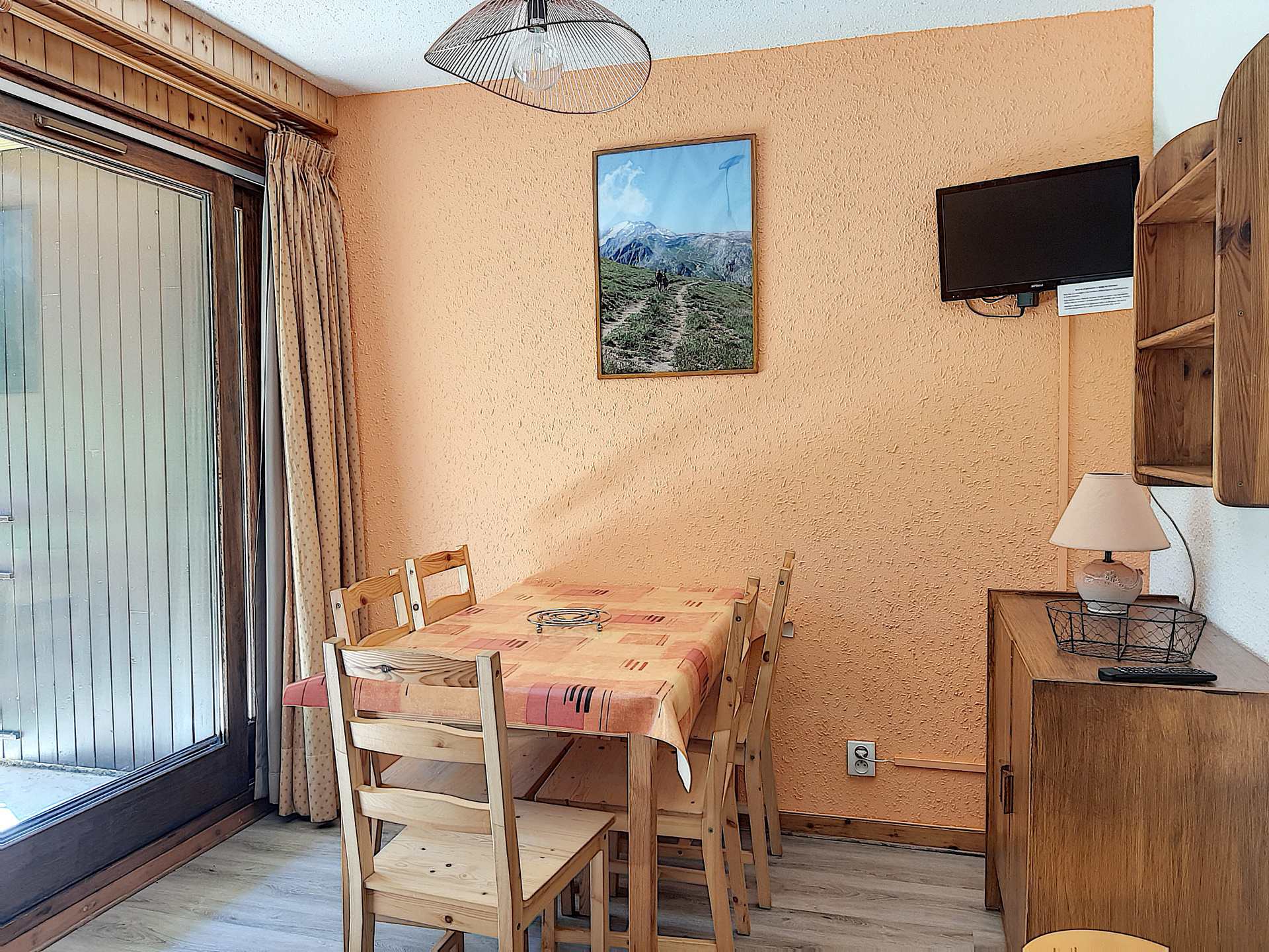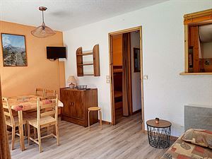 - SEJOUR doté d’un canapé convertible clic clac (130), une télévision, table pour 4 convives, parquet flottant au sol.