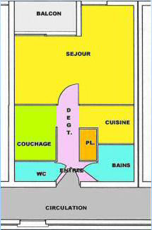 Logement d'environ 29m² classé 2 étoiles, comprenant un séjour, une cuisine, un coin montage, une salle de bain séparée des WC et un balcon orienté Sud-Ouest.