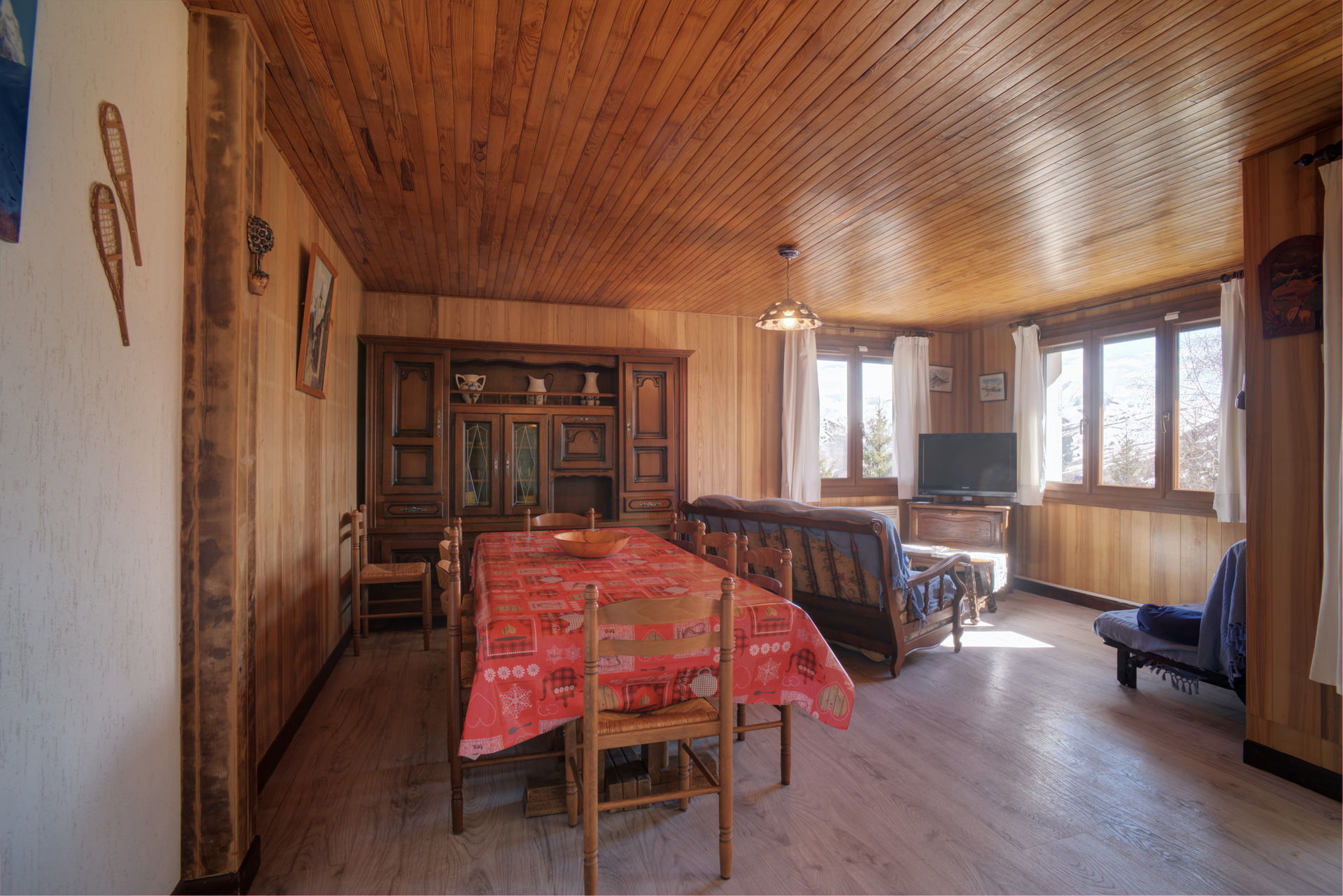 - SEJOUR : grande pièce orientée sud/ouest ; TV écran plat ; 2 banquettes fixes ; table + 8 chaises.
