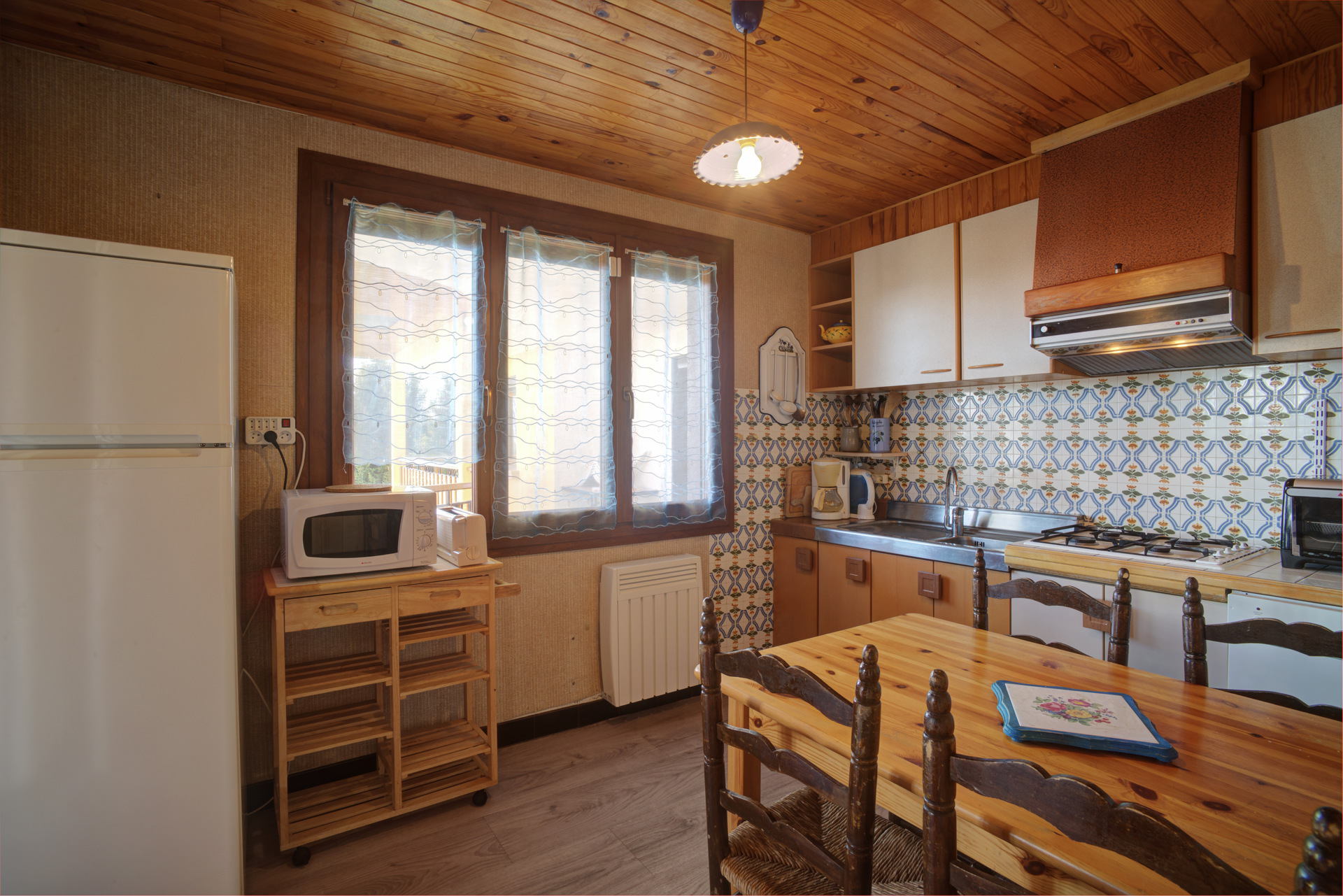 - CUISINE : lave-vaisselle, micro-ondes, mini-four, plaques de cuissons 4 feux (gaz), grand réfrigérateur + partie congélateur, table + 4 chaises. (Porte donnant sur l’entrée + porte accordéon donnant sur le séjour)