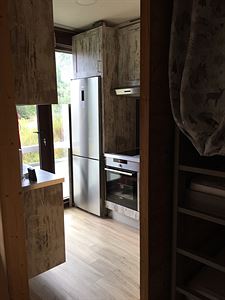 Une cuisine, un séjour, une alcôve fermée par un rideau, une salle d'eau, WC, volets électriques.