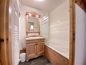 - SALLE DE BAIN : baignoire, sèche-serviettes électrique et meuble vasque